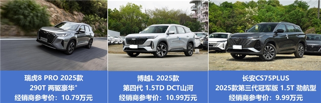 行业“内卷”给车企们带来了巨大压力,同时也让普通消费者有了更多选择的权利。在10-12万级别这一热门购车区间里,如果开一局“三国杀”,结果会如何呢?接下来,我们就以瑞虎8 PRO 2025款290T 两驱豪华+(以下简称:瑞虎8 PRO)、博越L 2025款 第四代 1.5TD DCT山河(以下简称:博越L)、长安CS75PLUS 2025款第三代冠军版 1.5T 劲航型(以下简称:长安CS75PLUS)为例,看一看谁的综合实力更有吸引力。值得一提的是,现在入手瑞虎8 PRO,购车即享25000元购车基金、至高15000元厂家置换补贴等好礼,助力用户轻松把好车开回家。